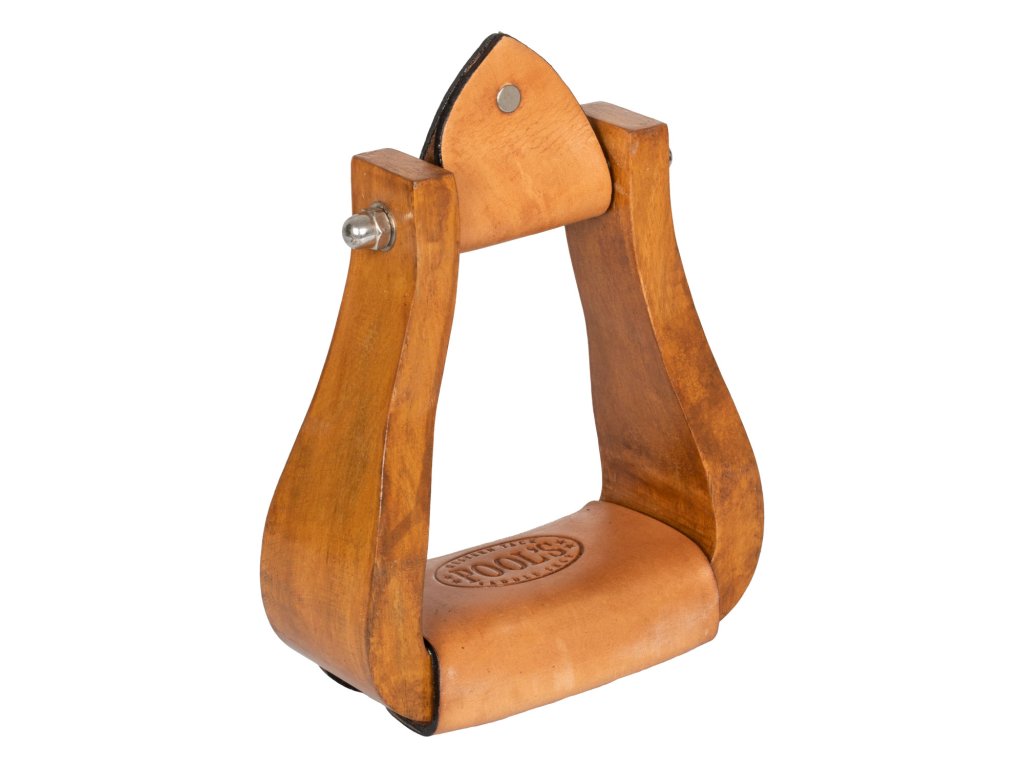 Westernové třmeny vyrobené z kvalitního dřeva. Mají široký a pohodlný tvar, který poskytuje stabilitu během jízdy na koni. Nášlapná plocha je obalena kůží. Třmeny jsou v přírodní barvě.