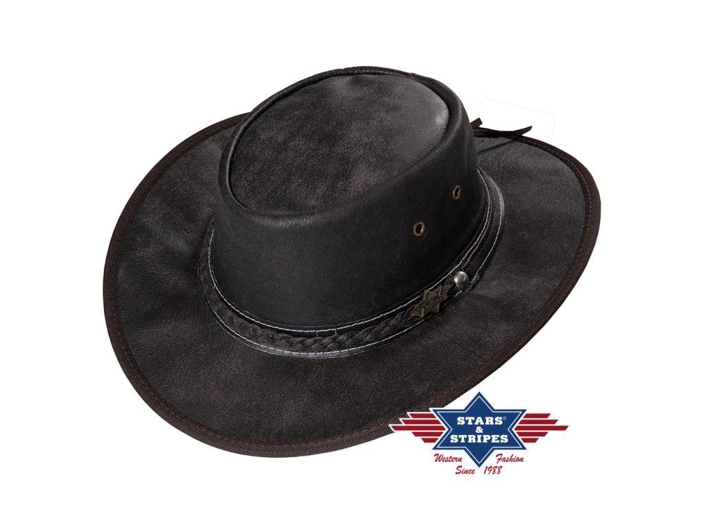 Westernový klobouk z buvolí kůže. Propracovaný klobouk z tmavě hnědého koženého copu, který končí nýtkem a má conchi na zadní straně. Díky elastickému vnitnímu obvodu je příjemný na nošení. Kožený cop je nastavitelný dle potřeby.