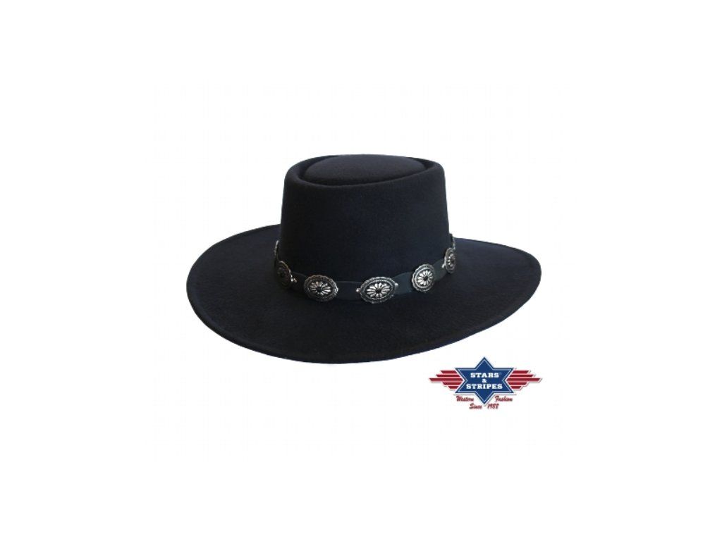 Tvarově stálý mexický westernový klobouk z umělé plsti s černým koženým páskem kolem klobouku. Perfektně sedí díky individuálně nastavitelnému vnitřnímu pásku.