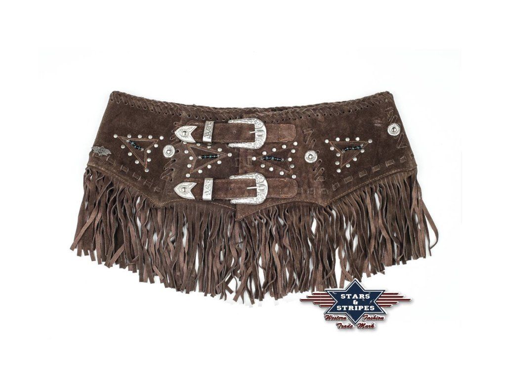 Westernový kožený pás s třásněmi Celia, velmi bohatě zdobený.