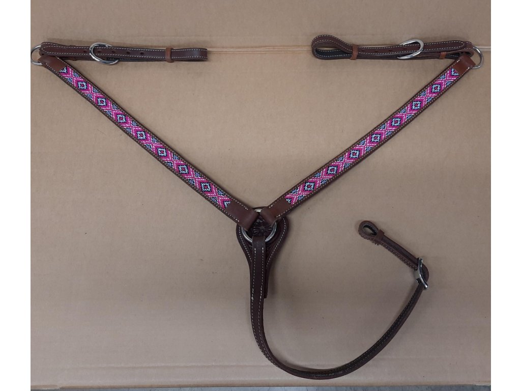 Kvalitní westernový poprsník s růžovými korálky. Tento poprsník kombinuje odolnou podšitou kůži s jemnou dekorací růžovými korálky, které dodávají elegantní a stylový vzhled. Je navržen tak, aby poskytoval maximální pohodlí a bezpečné uchycení sedla, což oceníte při každodenním ježdění i soutěžích.